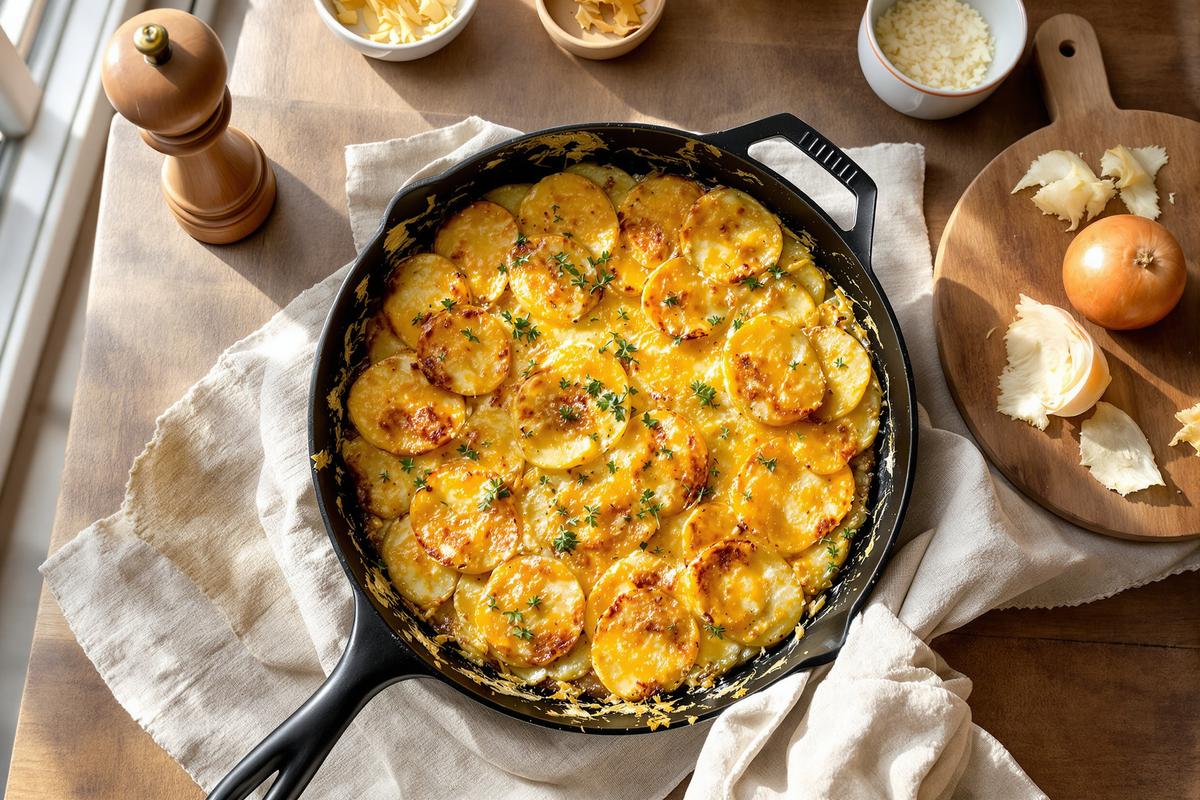 Pas besoin de plat à gratin. Une grande poêle avec couvercle suffit. Suivez ces étapes simples pour un gratin réussi dès la première fois :